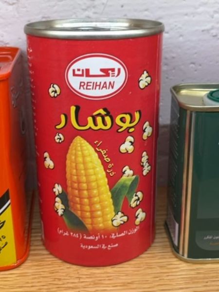 The packaging is a cylindrical tin with a vibrant red background, featuring an image of corn and popcorn to visually communicate the product inside. The branding is prominently displayed at the top of the can, providing a clear and attractive appearance.