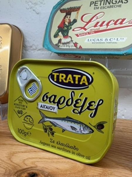 The packaging is a compact, rectangular tin with a vibrant yellow color that immediately draws attention. It features illustrations of sardines and olive branches, emphasizing its key ingredients. The pull-tab lid is convenient for easy opening.