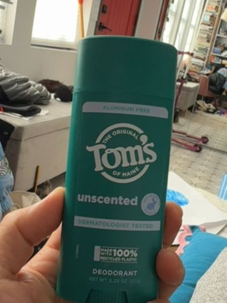 The typography on the packaging uses a friendly, casual serif font for the brand name 'Tom's,' giving it an approachable and trustworthy feel. The other text elements, such as 'unscented' and 'aluminum-free,' are set in a clean, modern sans-serif font that ensures readability and emphasizes clarity.
