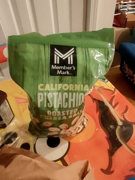 The packaging is a resealable green bag that features a bold, earthy design. It prominently displays the brand and product name in the center, with an image of pistachios at the bottom for visual appeal.