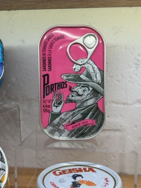 The packaging features a vibrant pink background with a stylized illustration of a musketeer holding a can of sardines. The illustration adds a vintage charm and captures attention with its bold lines and traditional attire.