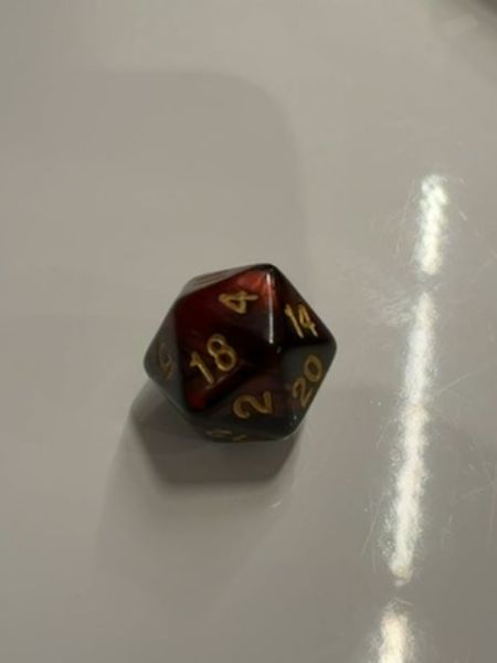 The dice itself is not shown in typical packaging but rather as a standalone object. It features a blend of dark and red marbling with gold numbering, conveying a sense of mystery and adventure.