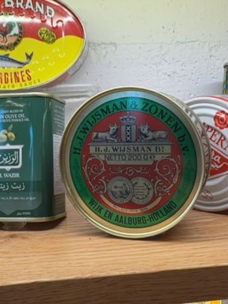 The typography features a classic serif typeface, providing a sense of tradition and reliability. The use of capital letters throughout emphasizes clarity and prominence, while the curved text follows the circular shape of the tin, creating a cohesive design.