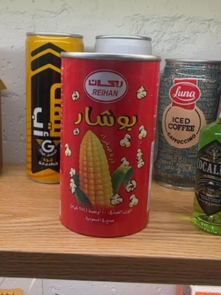 The packaging is a cylindrical red canister with a vibrant design. It features an image of corn with popped kernels, indicating the core ingredient. The overall design is eye-catching and suggests a food product.