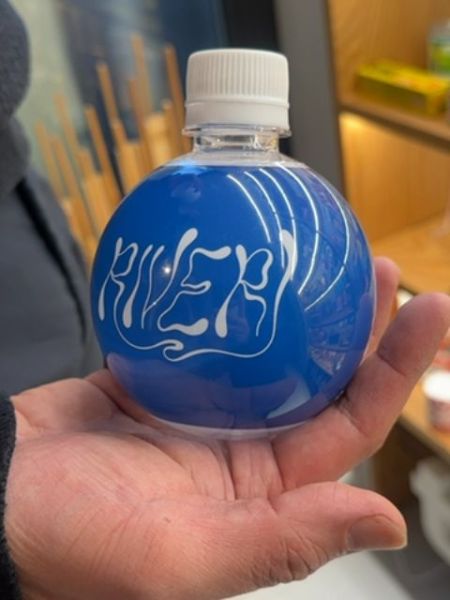 The packaging is a distinctive spherical bottle with a vivid blue color, making it visually appealing and unique. The bottle cap is simple and functional, typical of many beverage containers.