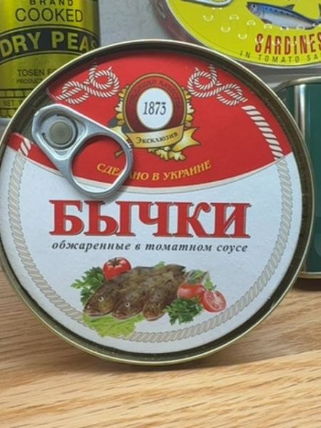 The packaging is a round metal can with a pull-tab lid. It features a vibrant red and white design, adorned with decorative gold accents and an image of the fish product with fresh tomatoes and herbs.