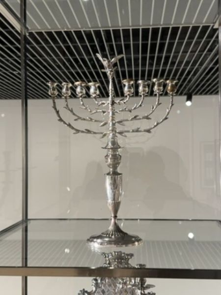 The image depicts an elegant silver menorah displayed in a glass case. Its branches are intricately designed, creating a refined and historical appearance.